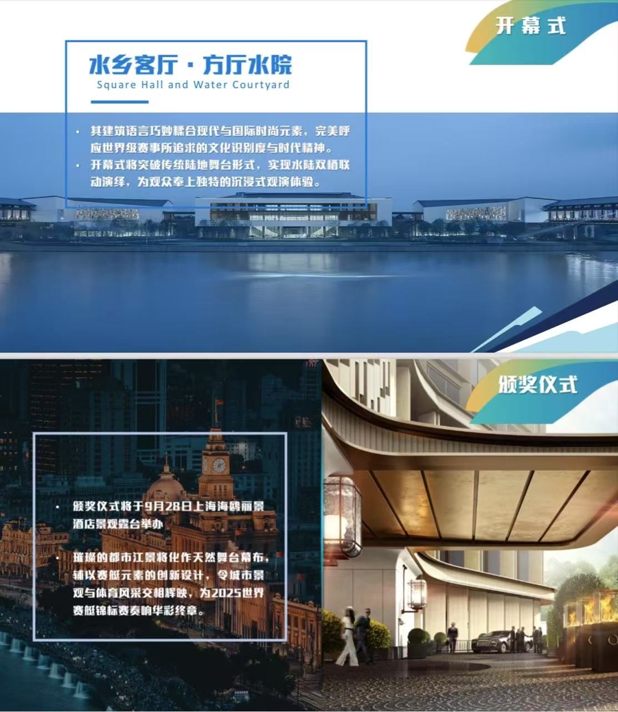 开幕式、颁奖仪式及闭幕式秉持节俭办赛原则,简洁且富创意。开幕式定于9月中旬在新启用的“水乡客厅·方厅水院”举行。其建筑语言巧妙糅合现代与国际时尚元素,完美呼应世界级赛事所追求的文化识别度与时代精神。开幕式将突破传统陆地舞台形式,实现水陆双栖联动演绎,为观众奉上独特的沉浸式观演体验。