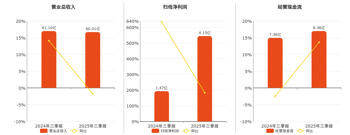 公司营业总收入为60.01亿元,较去年同报告期营业总收入减少1.09亿元,同比较去年同期下降1.79%。归母净利润为4.15亿元。经营活动现金净流入为8.36亿元。
